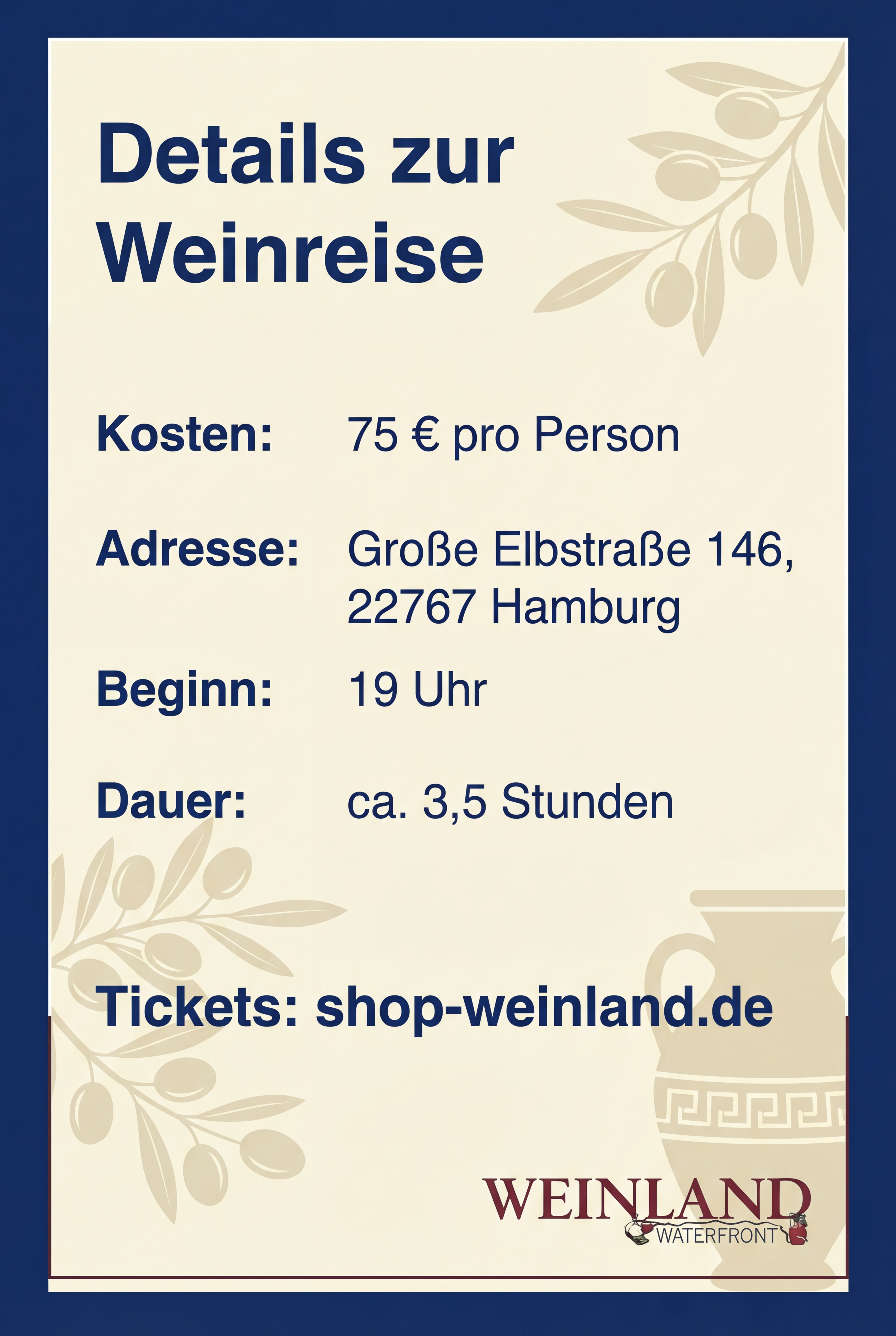 Griechische Weinreise am 4. April 2026: Am Osterwochenende erwartet euch hier bei uns eine Reise durch die griechische Weinwelt und Kulinarik. Am Samstag den 4. April werden hier vor Ort 6 griechische Weine verkostet und von einem Menü zum Satt werden begleitet. Mit dem Kauf dieses Artikels buchen Sie automatisch einen der sehr limitierten Plätze dieser Weinprobe. Eine Reservierung wie bei unseren anderen Weinproben ist dann nicht mehr notwendig. Diese Weinprobe ist die ideale Verabredung am Osterwochenende und wir würden uns freuen Sie dabei begrüßen zu dürfen! Bei Fragen zu der Verkostung melden Sie sich gerne bei uns entweder telefonisch oder per Mail.