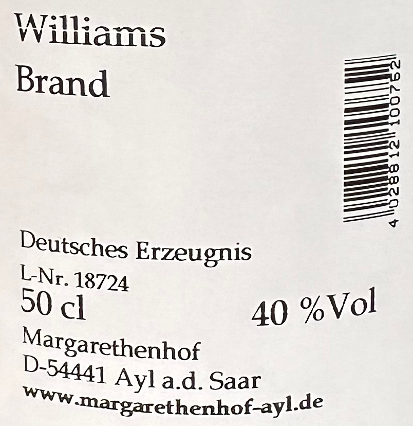 Weingut Margarethenhof Williams Brand: Das Weingut Margarethenhof in Ayl an der Saar wird geführt durch Nicolas Weber, welcher vor ein paar Jahren den Betrieb von seinen Eltern Jürgen und Dorothee übernahm. Großer Fruchtgenuss durch konsequentes Handwerk. Die Brände und Liköre des Weinguts sind ein wahrer Geheimtipp. Hier das konzentrierte Potential der reifen Williams Birnen als Brand.